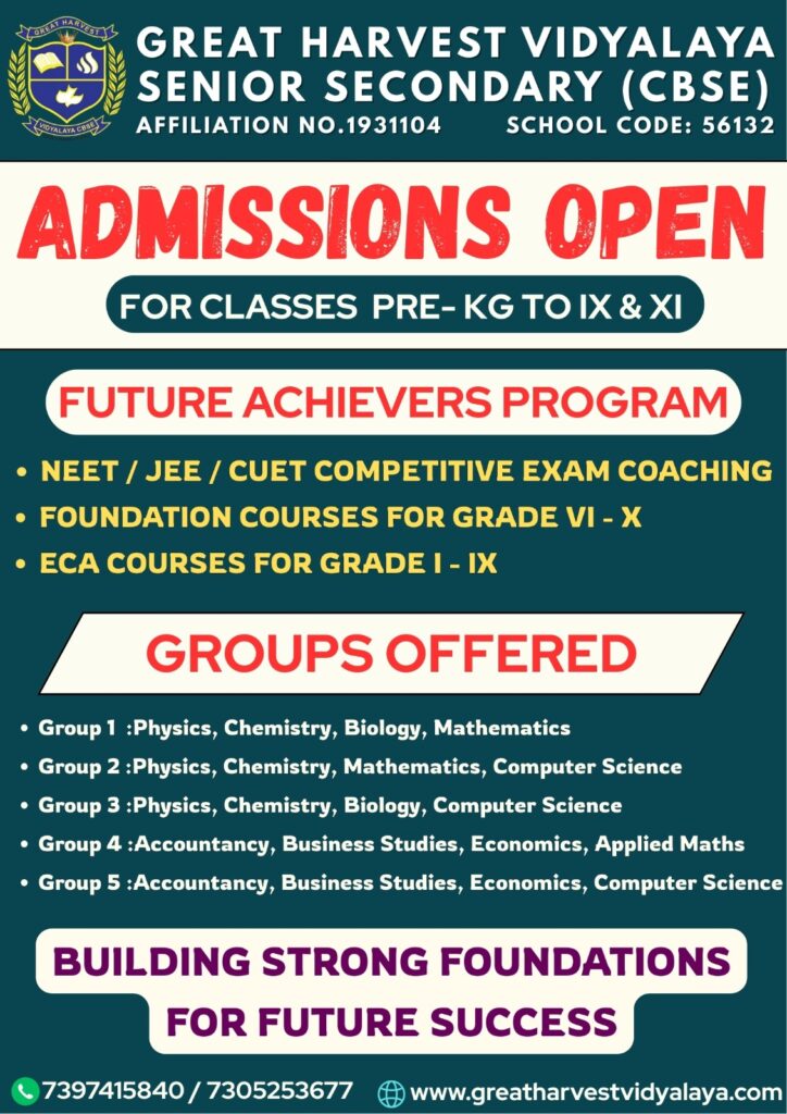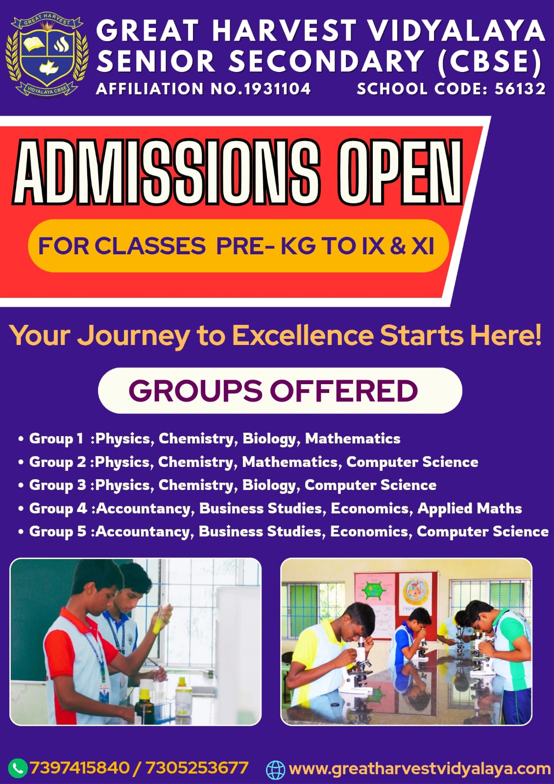 Great Harvest Vidyalaya is a leading Sr.Secondary school in Avadi, renowned for its academic excellence and comprehensive approach to student development. By nurturing young minds and fostering a supportive community, we equip our students with the skills, knowledge, and values necessary to succeed in an ever-changing world.